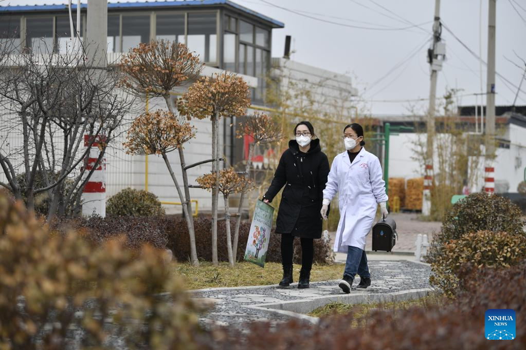 Doctor Dong Xiuqin (R) goes for home visits in Lingzishang Village, Fengnan District of Tangshan City, north China's Hebei Province, Jan. 11, 2023. As China now is entering a new phase of COVID response, Fengnan District has geared up to strengthen the roles of grassroots health facilities against the highly contagious virus. More than 500 health teams comprising over 1,100 medical personnel have been assembled to provide services for rural residents in the district. (Xinhua/Mu Yu)