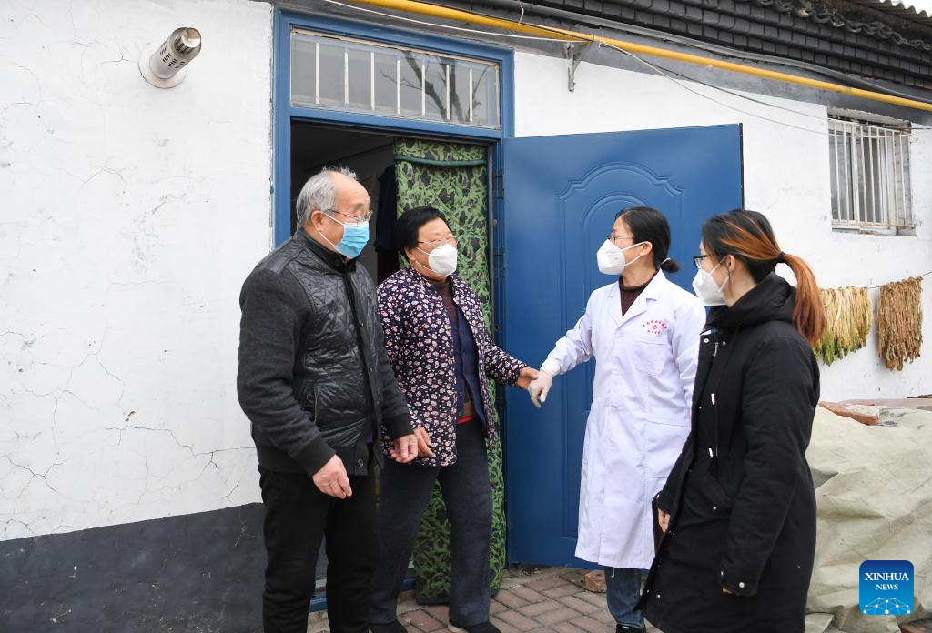 Doctor Dong Xiuqin (2nd R) talks with villagers during a home visit in Lingzishang Village, Fengnan District of Tangshan City, north China's Hebei Province, Jan. 11, 2023. As China now is entering a new phase of COVID response, Fengnan District has geared up to strengthen the roles of grassroots health facilities against the highly contagious virus. More than 500 health teams comprising over 1,100 medical personnel have been assembled to provide services for rural residents in the district. (Xinhua/Mu Yu)