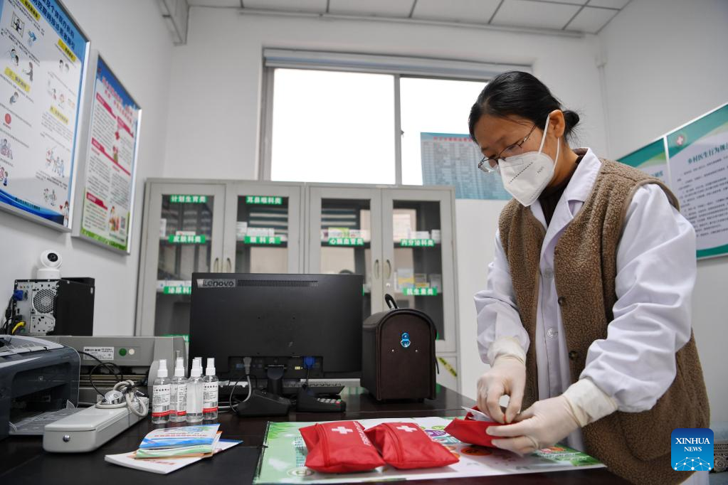 Doctor Wang Dongxue prepares medicines for home visits at a village clinic in Cuizhuanghu Village, Fengnan District of Tangshan City, north China's Hebei Province, Jan. 11, 2023. As China now is entering a new phase of COVID response, Fengnan District has geared up to strengthen the roles of grassroots health facilities against the highly contagious virus. More than 500 health teams comprising over 1,100 medical personnel have been assembled to provide services for rural residents in the district. (Xinhua/Mu Yu)