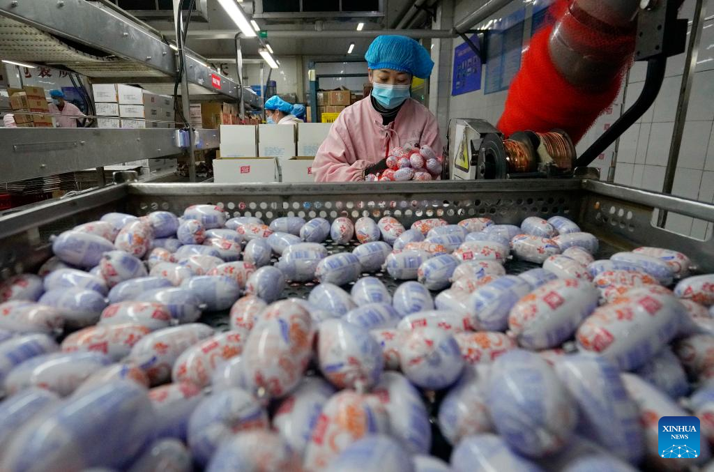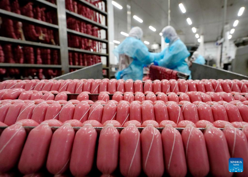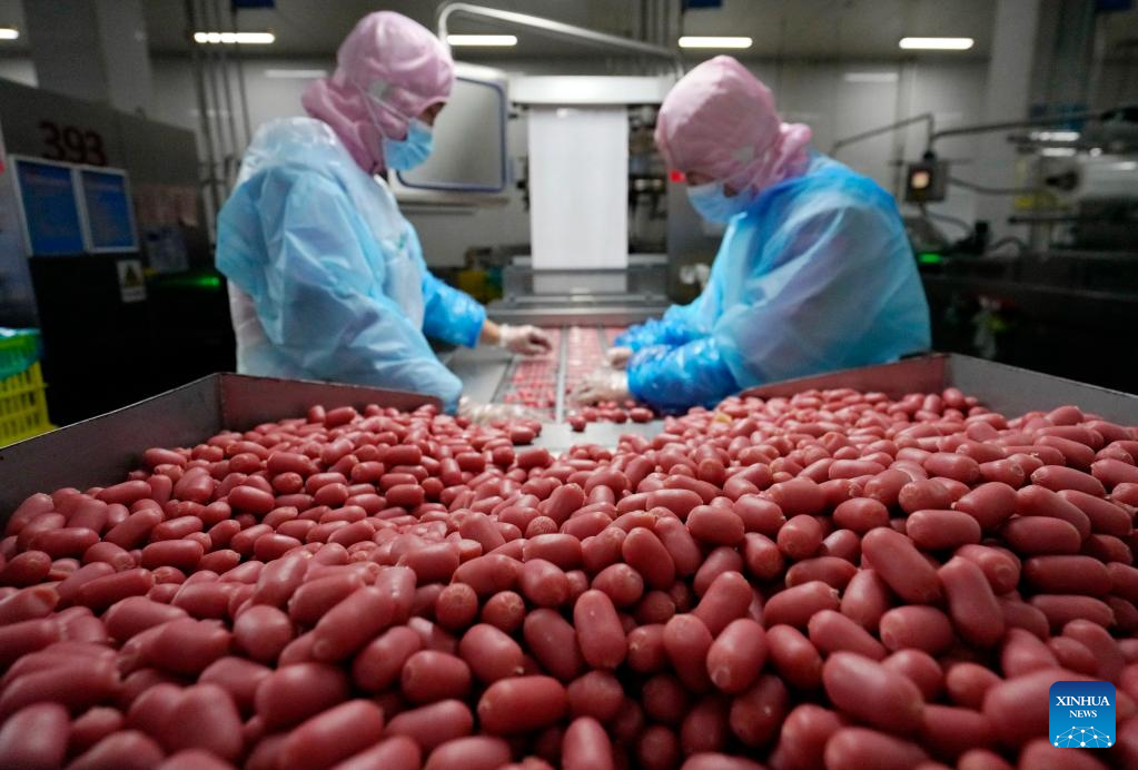Employees work in a sausage factory in Yutian County, Tangshan City, north China's Hebei Province, Jan. 12, 2023. The food processing enterprises in Yutian ramped up production to meet the market demands for the upcoming Chinese Lunar New Year. (Xinhua/Yang Shiyao)