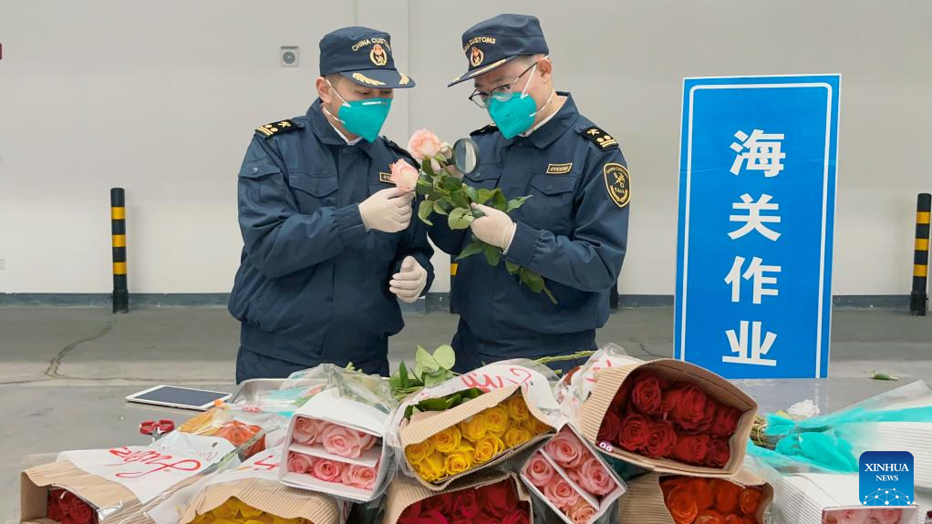 Customs officers of the Changsha Huanghua International Airport inspect fresh-cut roses imported from Africa in Changsha, central China's Hunan Province, Jan. 12, 2023. A total of 3,000 fresh-cut roses from Nairobi, Kenya, landed Thursday morning in Changsha, central China's Hunan Province, marking the first batch of African flowers exported to Hunan in almost three years. (Changsha Customs/Handout via Xinhua)