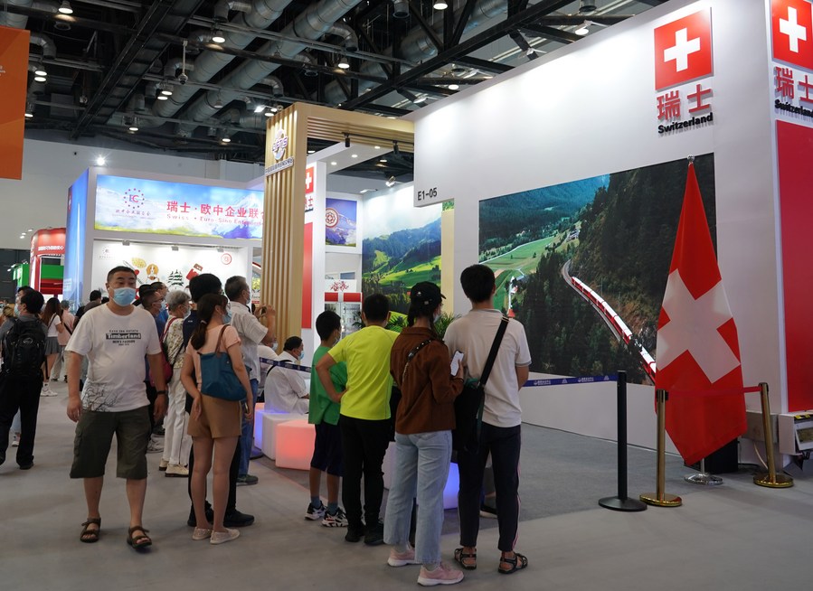 People visit the booth of Switzerland at the China National Convention Center during the 2022 China International Fair for Trade in Services (CIFTIS) in Beijing, capital of China, Sept. 4, 2022. (Xinhua/Ren Chao)