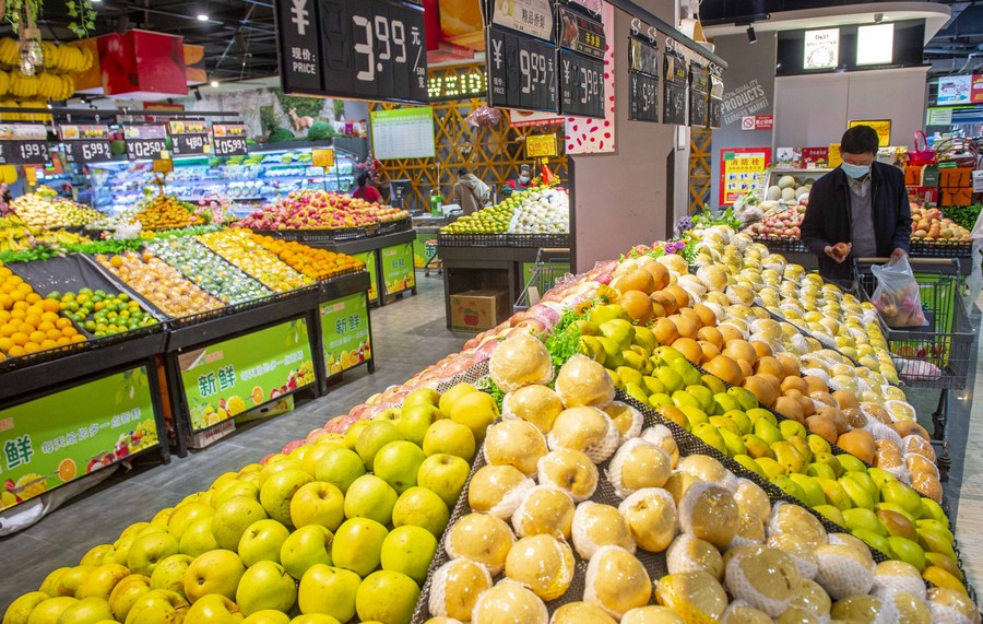 A man shops at a supermarket in Congjiang County, southwest China's Guizhou Province, Oct. 14, 2022. (Photo by Lu Zhongnan/Xinhua)