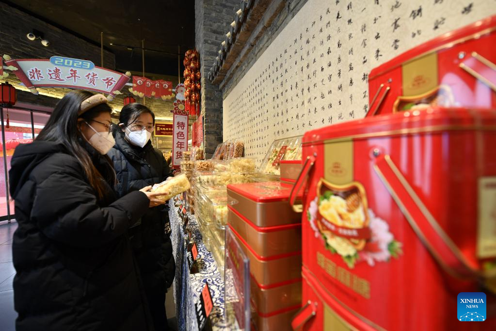 A Spring Festival fair themed on intangible cultural heritage was held in Fengrun District of Tangshan, selling chess-shaped sesame seed cakes, sesame seed candies and other traditional foods. Intangible cultural heritages including Pingju Opera, paper cutting, and calabash pyrography were also presented at the fair. (Xinhua/Mu Yu)