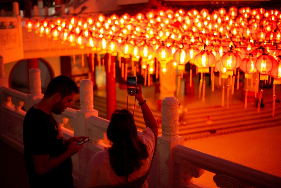 Visitors take photos of red lanterns at Thean Hou Temple in Kuala Lumpur, Malaysia on Jan. 13, 2023. (Photo by Zhu Wei/Xinhua)