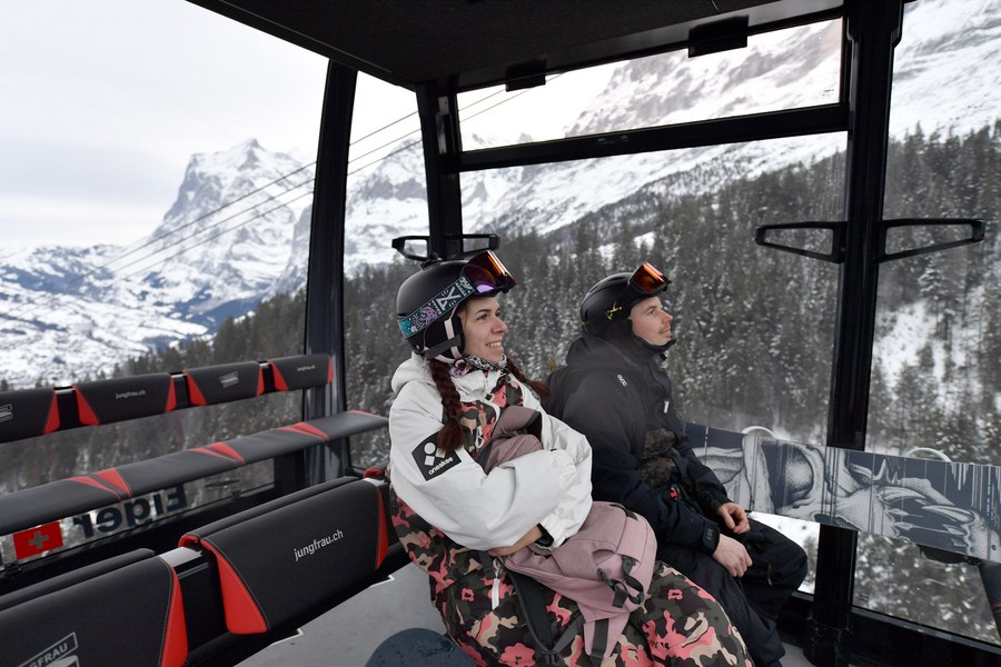Skiers take a cable car up the Jungfrau Mountain in Switzerland, Jan. 12, 2023. (Xinhua/Lian Yi)