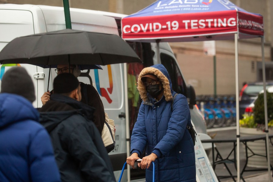 People walk past a COVID-19 testing site in New York, the United States, on Dec. 7, 2022. (Photo by Michael Nagle/Xinhua)