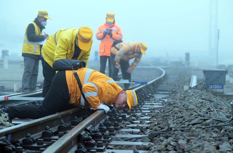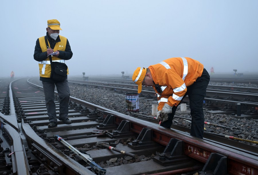 Workers carry out a maintenance task along a railway section at Hefei East Railway Station in Hefei, east China's Anhui Province, Jan. 13, 2023. (Xinhua/Zhou Mu)