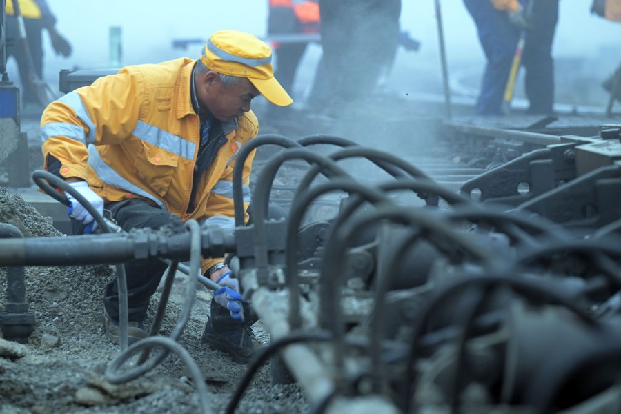 A worker carries out a maintenance task along a railway section at Hefei East Railway Station in Hefei, east China's Anhui Province, Jan. 13, 2023. (Xinhua/Zhou Mu)