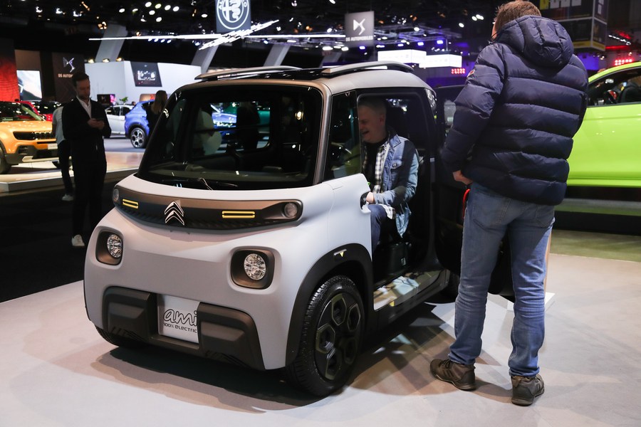 Visitors experience a Citroen Ami electric vehicle during the press day of the 100th Brussels Motor Show in Brussels, Belgium, Jan. 13, 2023. (Xinhua/Zheng Huansong)■