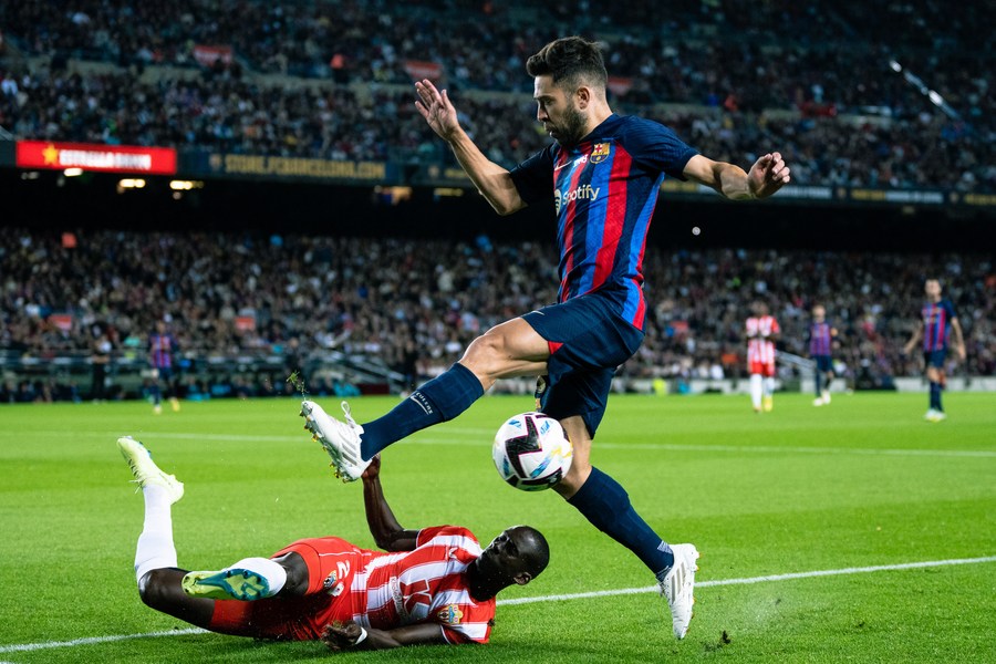 Jordi Alba (R) of Barcelona vies with Houboulang Mendes of Almeria during their La Liga at Camp Nou, Barcelona, Spain, on Nov. 5, 2022. (Photo by Joan Gosa/Xinhua)