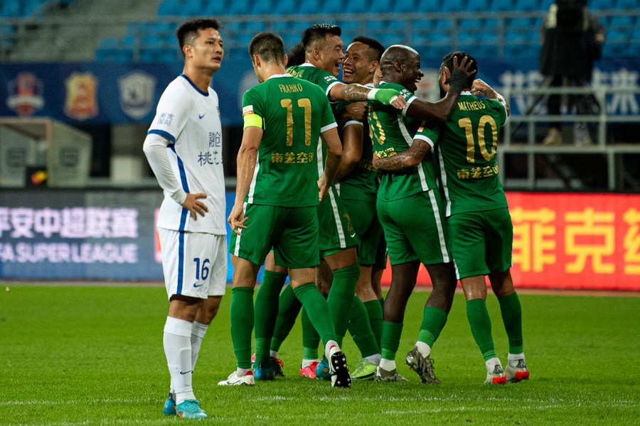 Leung Nok Hang (3th R) of Zhejiang celebrates scoring with his teammates against Wuhan Three Towns in Huzhou, east China's Zhejiang Province, Oct. 4, 2022. (Xinhua/Jiang Han)