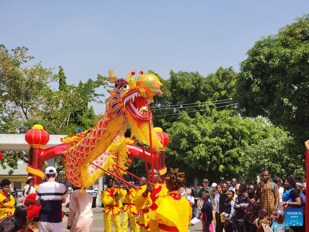 This photo taken on Jan. 14, 2023 shows a dragon dance performance during an event held in celebration of the upcoming Year of the Rabbit in Abuja, Nigeria. (Xinhua/Guo Jun)