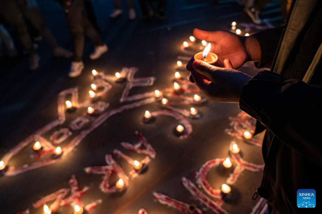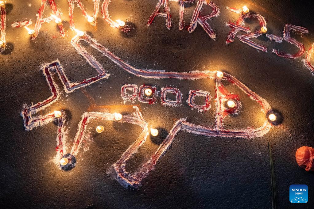 A lamp lighting ceremony in remembrance of victims of a plane crash is attended by college students in Kathmandu, Nepal, Jan. 16, 2023. The plane operated by Nepal's Yeti Airlines was flying from Kathmandu to Pokhara with 68 passengers and four crew members on board, when it went down into the Seti River gorge on Sunday, and 68 bodies had been recovered from the crash site. (Photo by Hari Maharjan/Xinhua)