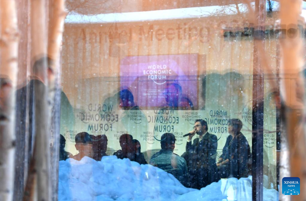People communicate with each other at the Congress Center for the World Economic Forum (WEF) Annual Meeting 2023 in Davos, Switzerland, Jan. 15, 2023. The World Economic Forum (WEF) Annual Meeting 2023 is scheduled to kick off in Davos on Jan. 16. The meeting is themed "Cooperation in a Fragmented World." (Xinhua/Lian Yi)