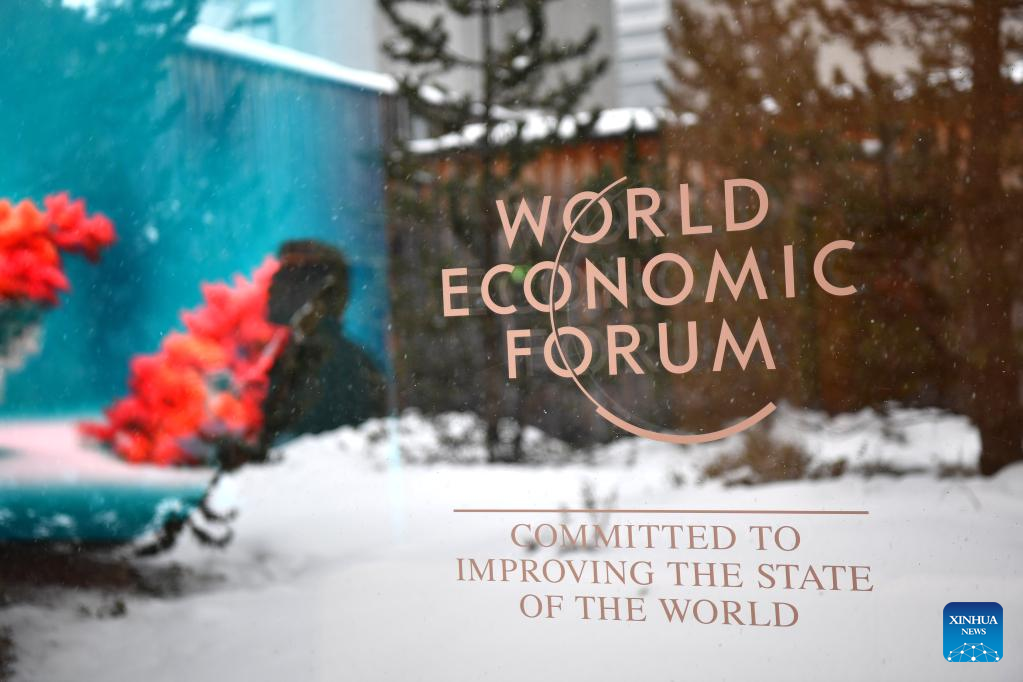 This photo taken on Jan. 15, 2023 shows the logo of the World Economic Forum (WEF) in Davos, Switzerland. The World Economic Forum (WEF) Annual Meeting 2023 is scheduled to kick off in Davos on Jan. 16. The meeting is themed "Cooperation in a Fragmented World." (Xinhua/Lian Yi)