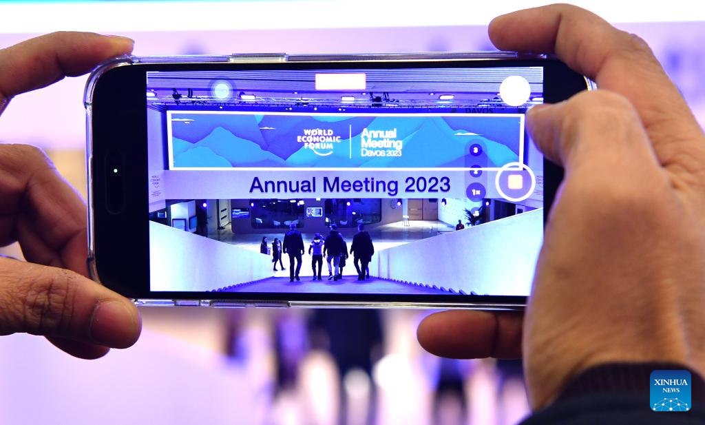 A participant takes a photo of people visiting the Congress Center for the World Economic Forum (WEF) Annual Meeting 2023 in Davos, Switzerland, Jan. 15, 2023. The World Economic Forum (WEF) Annual Meeting 2023 is scheduled to kick off in Davos on Jan. 16. The meeting is themed "Cooperation in a Fragmented World." (Xinhua/Lian Yi)