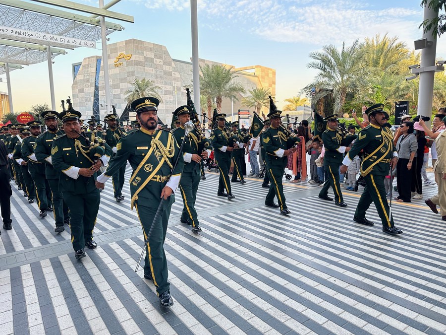 A band formation of the local police is seen during a parade celebrating the upcoming Chinese New Year at Expo City Dubai in Dubai, the United Arab Emirates (UAE), Jan. 14, 2023. (Xinhua)