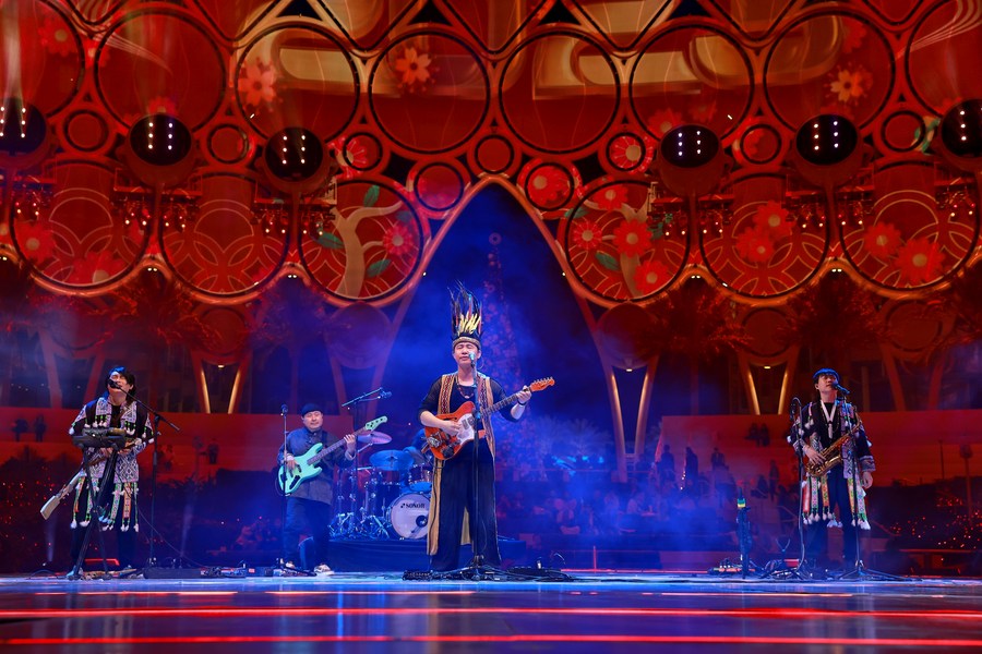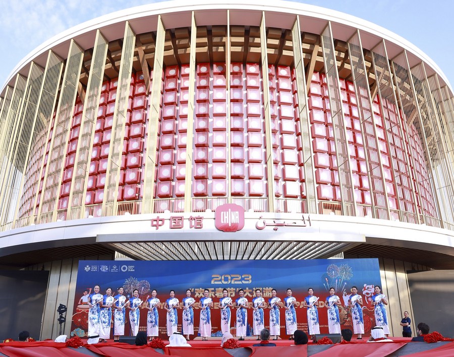 People perform in front of the China Pavilion at Expo City Dubai in Dubai, the United Arab Emirates (UAE), Jan. 14, 2023. (Xinhua)