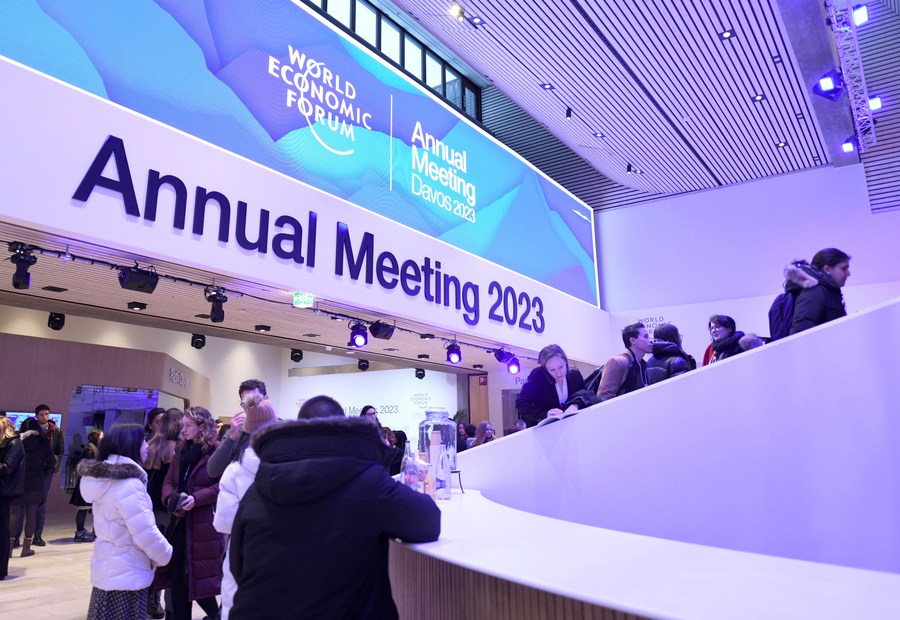 People communicate with each other at the Congress Center for the World Economic Forum (WEF) Annual Meeting 2023 in Davos, Switzerland, Jan. 15, 2023. (Xinhua/Lian Yi)