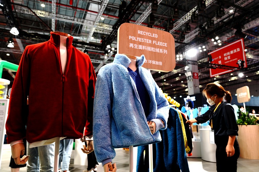 An exhibitor introduces recycled polyester fleece of Uniqlo at the fifth China International Import Expo (CIIE) in east China's Shanghai, Nov. 7, 2022. (Xinhua/Zhang Jiansong)