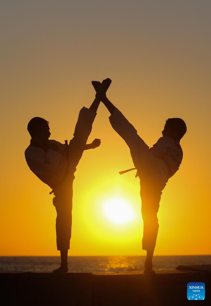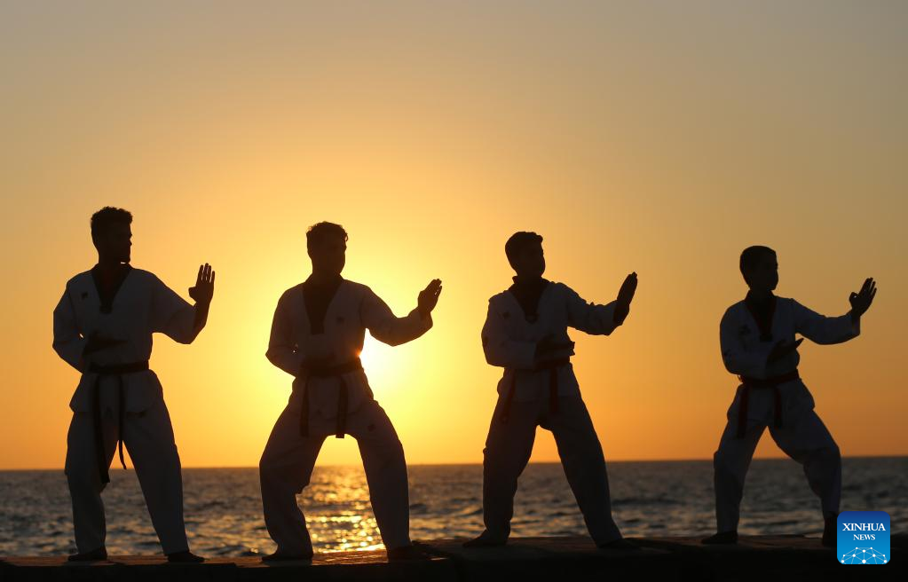 People practice taekwondo on a beach of the Mediterranean Sea in southern Gaza Strip city of Khan Younis, on Jan. 17, 2023. (Photo by Yasser Qudih/Xinhua)