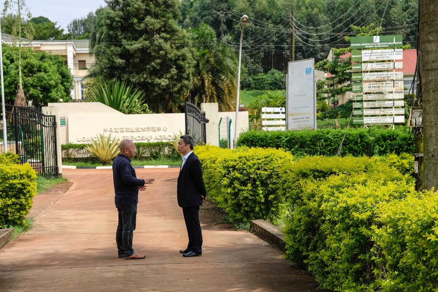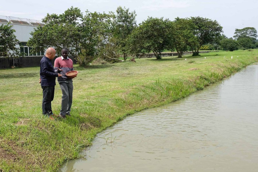 Chinese agriculture expert Chen Taihua (L) talks to Zhang Xiaoqiang, head of the Chinese agriculture team for the third phase under the framework of the UN Food and Agriculture Organization (FAO)-China South-South Program, at the Aquaculture Research and Development Centre in Kajjansi, Wakiso District, Uganda, Dec. 21, 2022. (Photo by Hajarah Nalwadda/Xinhua)