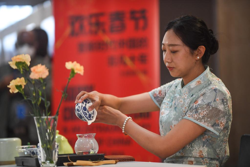 A Chinese language teacher of the Confucius Institute at Addis Ababa University (AAU) performs a tea ceremony during a special ceremony of the exhibition themed Happy Chinese New Year and an Extraordinary Decade of China in the New Era, in Addis Ababa, Ethiopia, on Jan. 17, 2023. (Xinhua/Michael Tewelde)