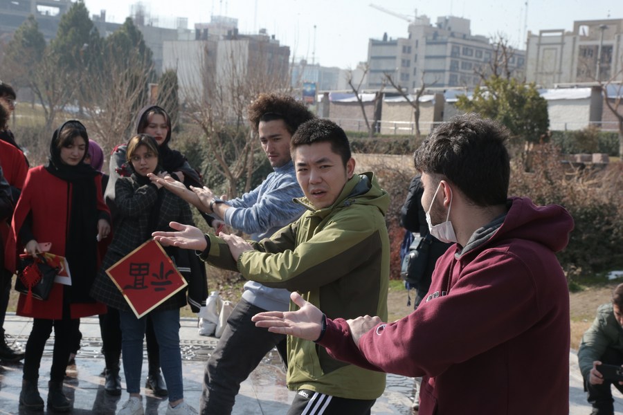 Teachers from the Confucius Institute also cut the Chinese character "fu" meaning "good fortune" with paper, wrote calligraphy, and practised Taijiquan, a Chinese martial art, to showcase the Chinese culture in different fashions to the Iranian students.