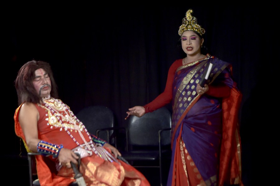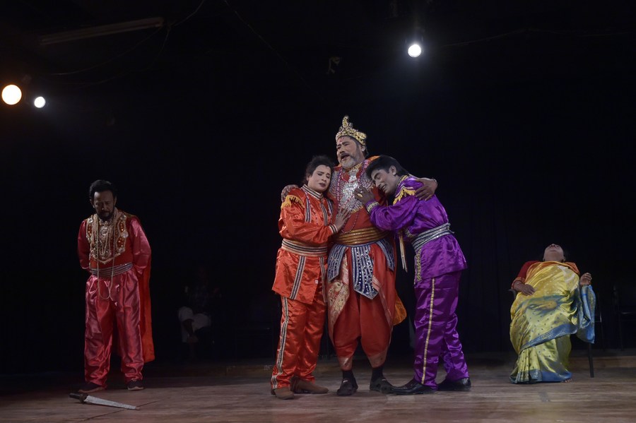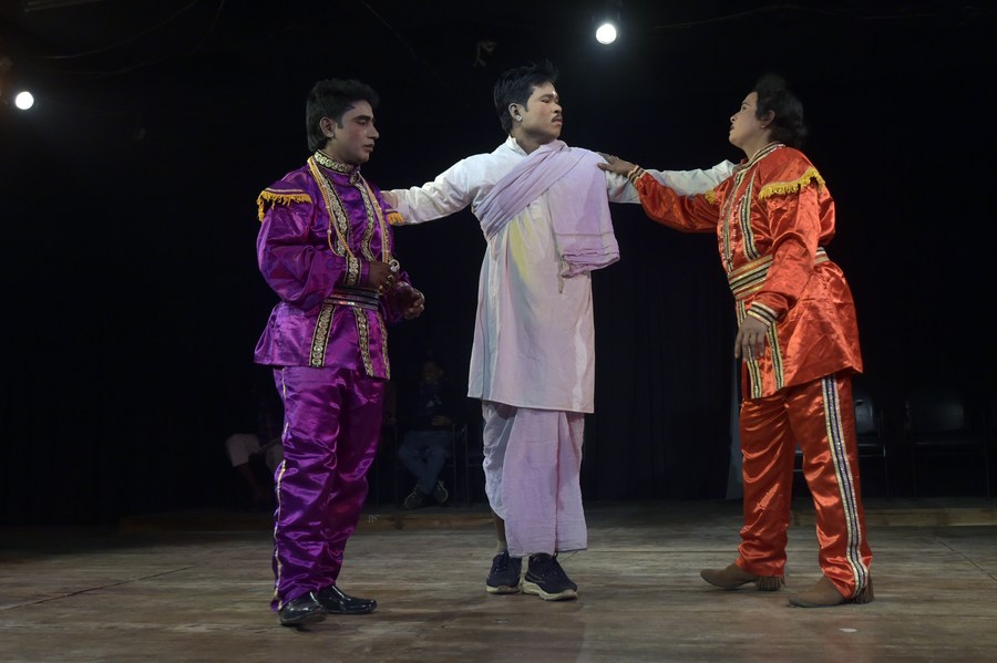 Photo shows artists performing a scene of jatra (a popular folk-theater form of Bengali theater) in Dhaka, Bangladesh Jan. 18, 2023. (Xinhua/Salim)