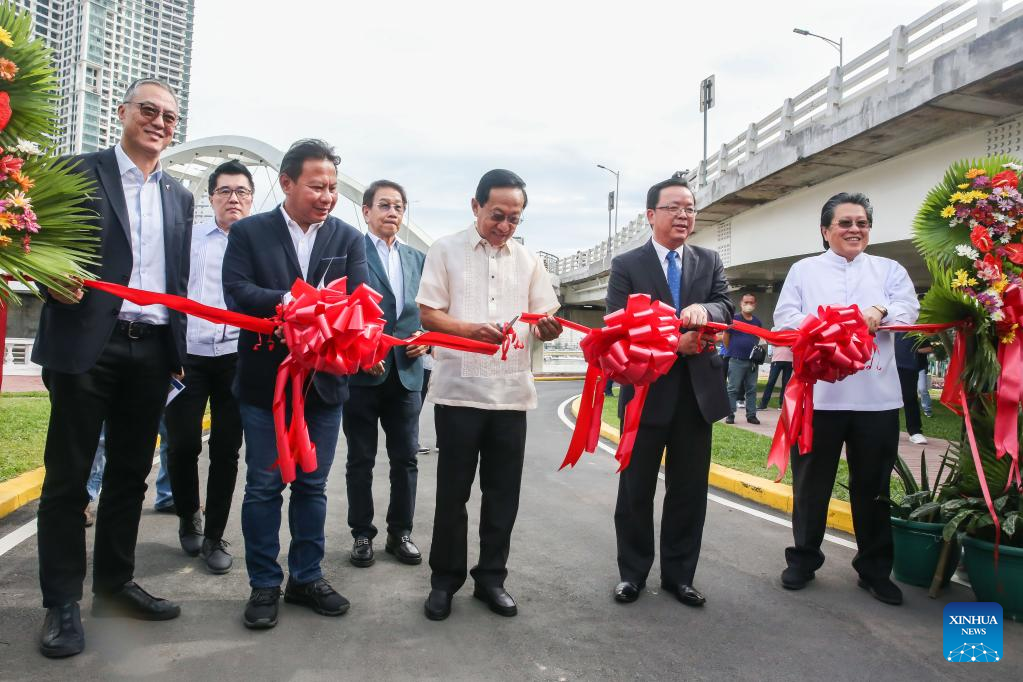 China's Ambassador to the Philippines Huang Xilian (2nd R), Philippine Public Works and Highways Secretary Manuel Bonoan (3rd R) and other officials attend the ceremonial opening of the surrounding park of the Binondo-Intramuros Bridge in Manila, the Philippines, Jan. 20, 2023. Filipinos can now walk safely and leisurely to enjoy the newly-opened linear riverside park gifted by China here on Friday. (Xinhua/Rouelle Umali)
