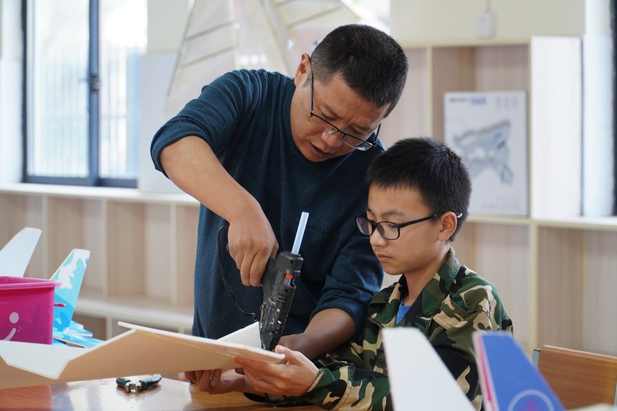 A student makes model airplanes with the help of his teacher at Furong school in Sangzhi County, central China's Hunan Province, Nov. 11, 2022. (Xinhua/Zhang Ge)