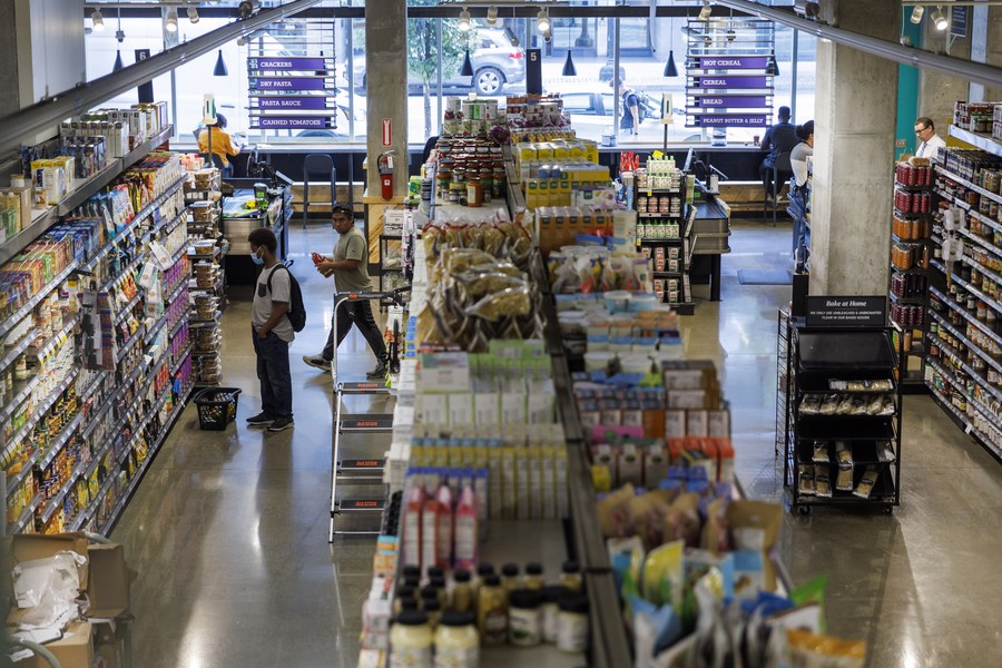 Customers select goods at a supermarket in Washington, D.C., the United States, July 13, 2022. (Photo by Ting Shen/Xinhua)