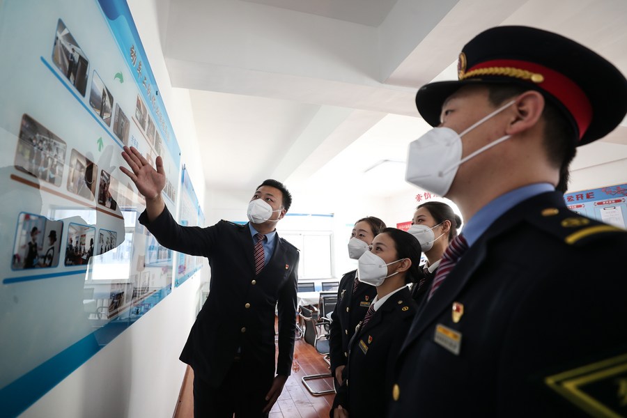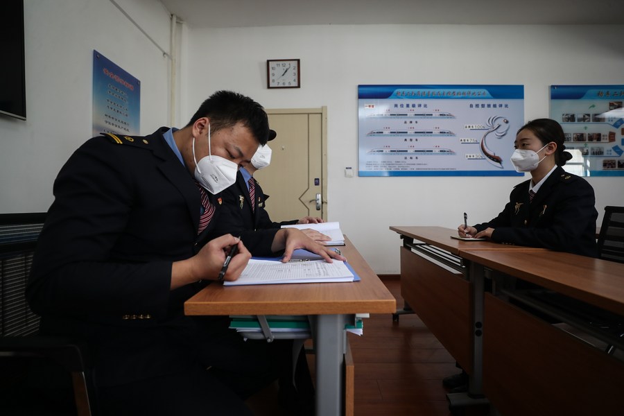 Deputy train conductor Zhao Peng (L) and his colleagues prepare for work in Shenyang, northeast China's Liaoning Province, Oct. 18, 2022. (Xinhua/Pan Yulong)