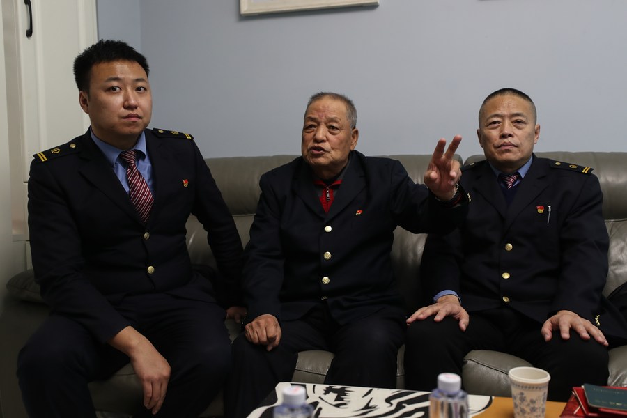 Deputy train conductor Zhao Peng (L) poses for a photo with his grandfather Zhao Zhenru (C) and father Zhao Zeqiang in Shenyang, northeast China's Liaoning Province, Oct. 18, 2022. (Xinhua/Pan Yulong)
