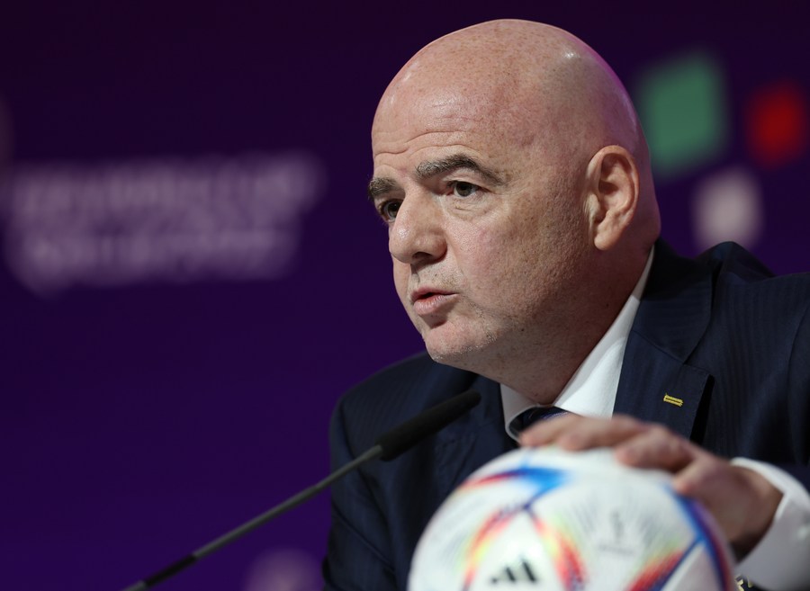 FIFA President Gianni Infantino speaks during a media briefing at 2022 Qatar World Cup Main Media Center in Doha, Qatar on Nov. 19, 2022. (Xinhua/Jia Haocheng)