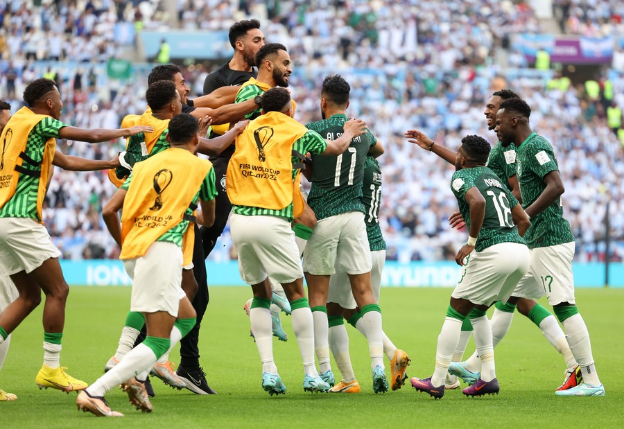 Players of Saudi Arabia celebrate scoring during the Group C match against Argentina at the 2022 FIFA World Cup at Lusail Stadium in Lusail, Qatar on Nov. 22, 2022. (Xinhua/Han Yan)