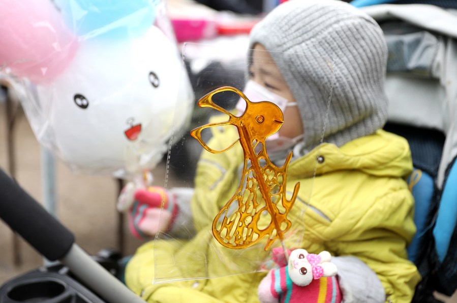 A child holds a sugar painting in the shape of rabbit at an open air market for Spring Festival goods in Shenyang, northeast China's Liaoning Province, Jan. 12, 2023. (Xinhua/Yao Jianfeng)