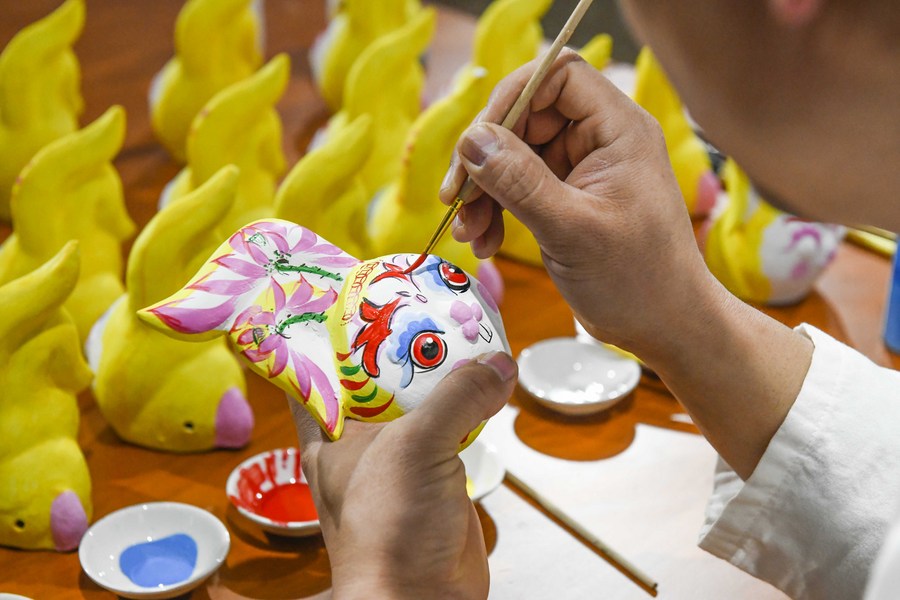 A folk artist colours a piece of work at a clay figurine workshop in Yutian County, north China's Hebei Province, Jan. 16, 2023. (Photo by Liu Mancang/Xinhua)