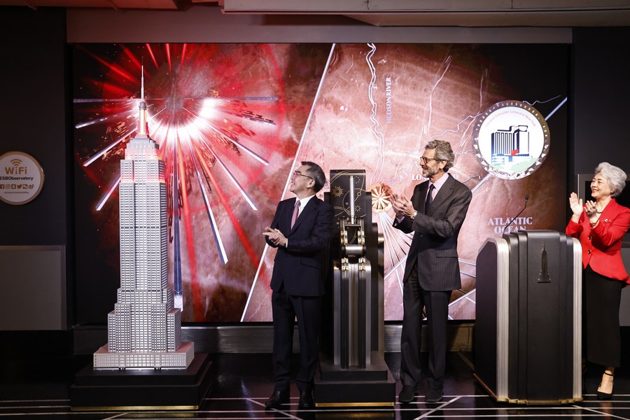 Huang Ping (L), Chinese Consul General in New York, and Tony Malkin (C), chairman, president, and CEO of Empire State Realty Trust, jointly kick off ceremonial lighting of the Empire State Building in New York, the United States, on Jan. 20, 2023. (Photo by Winston Zhou/Xinhua)
