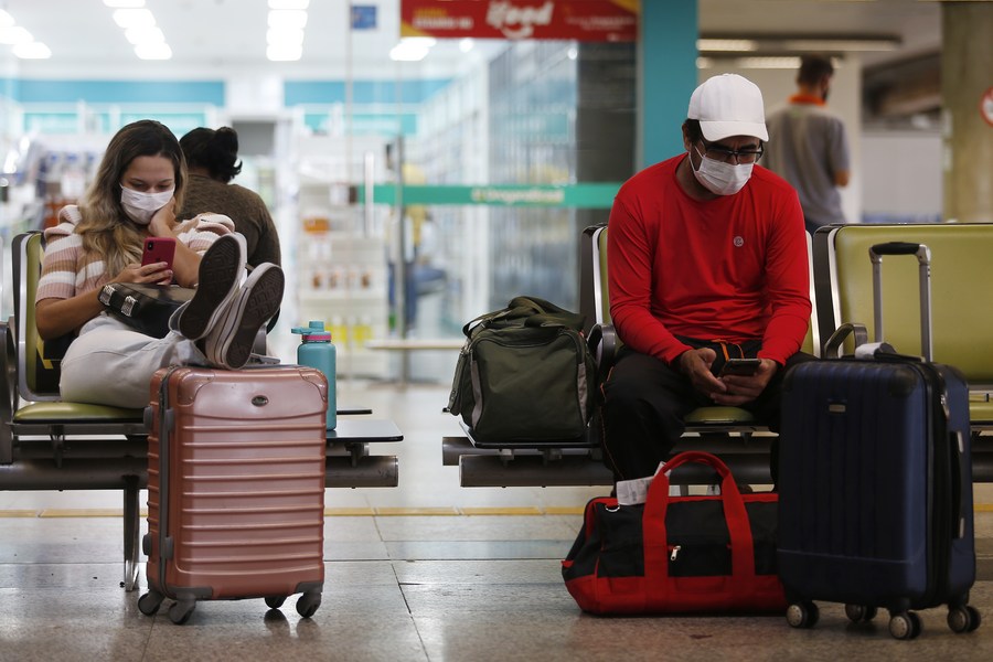 Passengers wearing face masks are seen at Brasilia's Juscelino Kubitschek international airport, Brazil, Nov. 26, 2022. (Photo by Lucio Tavora/Xinhua)