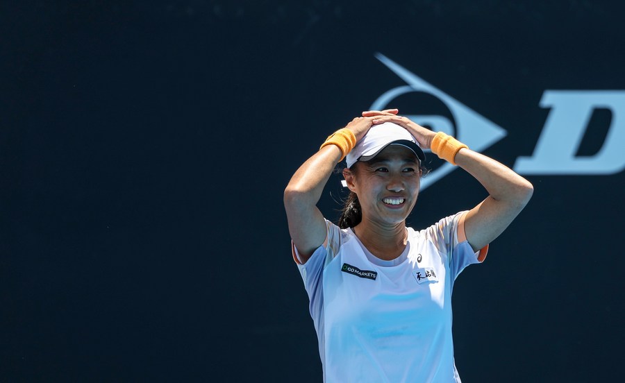 Zhang Shuai of China celebrates after winning the women's singles third round match against Katie Volynets of the United States at Australian Open tennis tournament in Melbourne, Australia on Jan. 21, 2023. (Xinhua/Bai Xuefei)