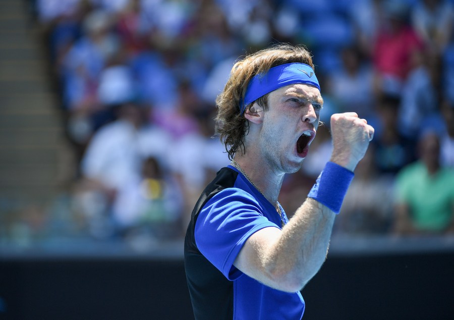 Andrey Rublev celebrates scoring during the men's singles third round match against Daniel Evans of Britain at Australian Open tennis tournament in Melbourne, Australia on Jan. 21, 2023. (Xinhua/Guo Lei)