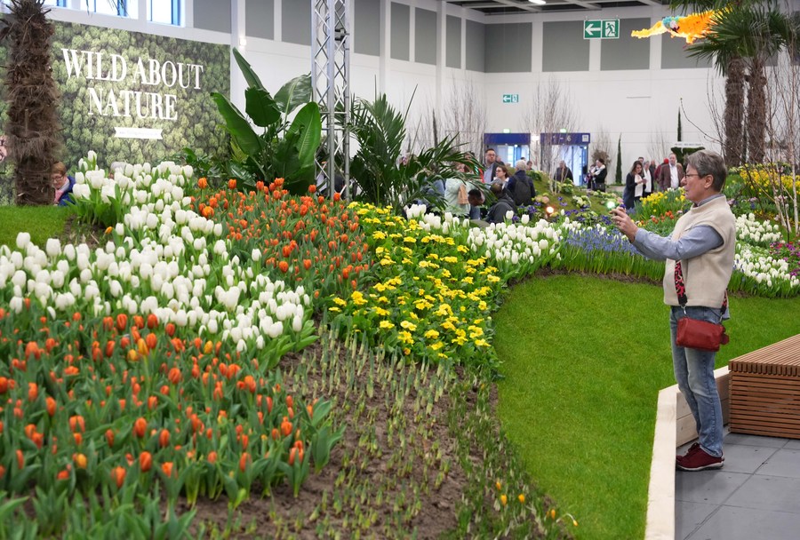 A visitor takes photos of flowers exhibited during the International Green Week (IGW) in Berlin, Germany, Jan. 20, 2023. (Photo by Stefan Zeitz/Xinhua)