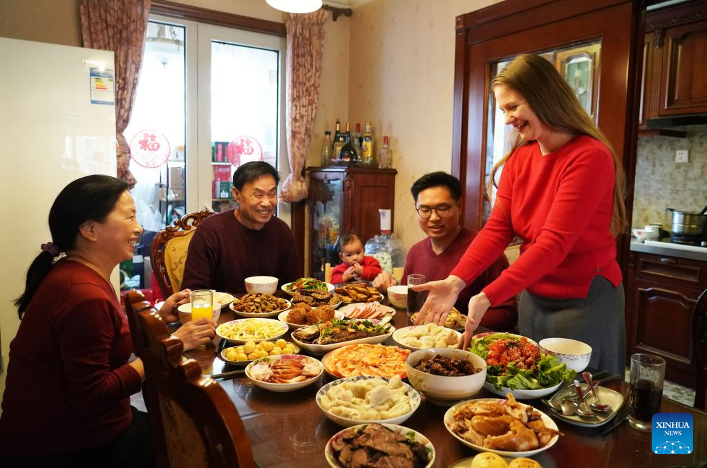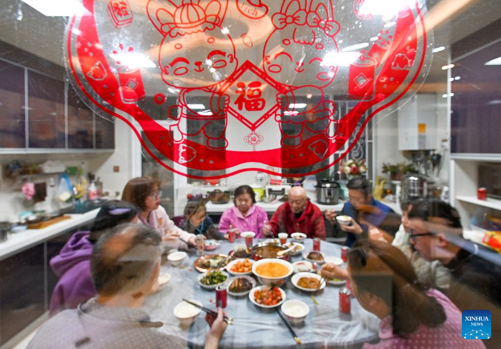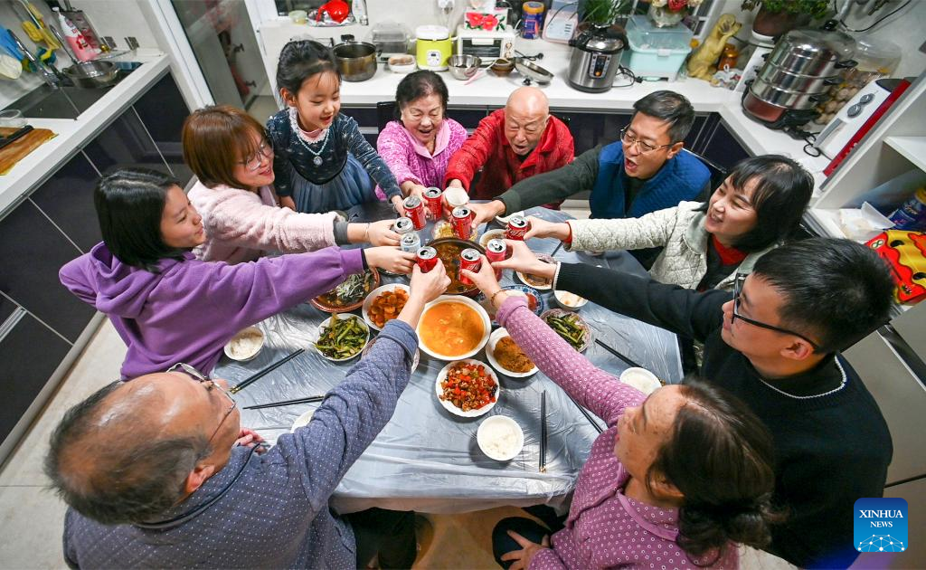 People enjoy a feast on the eve of the Spring Festival at their home in Beijing, capital of China, Jan. 21, 2023. On the eve of the Spring Festival in China, while some people reunite with their families and friends, there are others who still stick to their posts away from home. Nevertheless, nothing can stop a warm gathering and delicious festive dinner while they await the arrival of the Spring Festival. (Xinhua/Ren Chao)