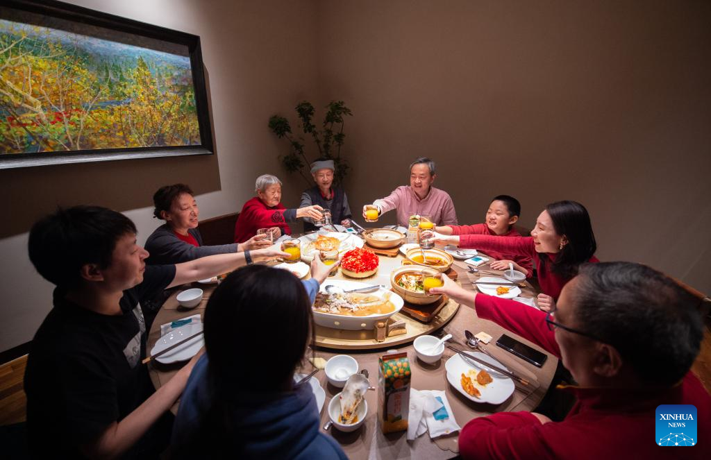 People enjoy a family feast in Beijing, capital of China, Jan. 21, 2023. On the eve of the Spring Festival in China, while some people reunite with their families and friends, there are others who still stick to their posts away from home. Nevertheless, nothing can stop a warm gathering and delicious festive dinner while they await the arrival of the Spring Festival. (Xinhua/Ren Chao)