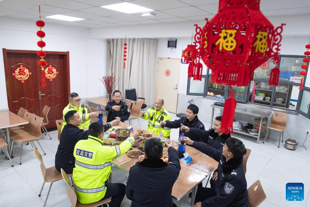 Police officers and auxiliary police officers enjoy a feast on the eve of the Spring Festival at the canteen of Dongshan Police Station in Yichang, central China's Hubei Province, Jan. 21, 2023. On the eve of the Spring Festival in China, while some people reunite with their families and friends, there are others who still stick to their posts away from home. Nevertheless, nothing can stop a warm gathering and delicious festive dinner while they await the arrival of the Spring Festival. (Xinhua/Xiao Yijiu)