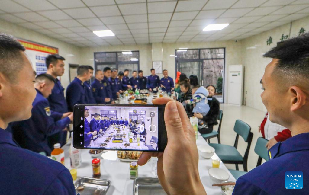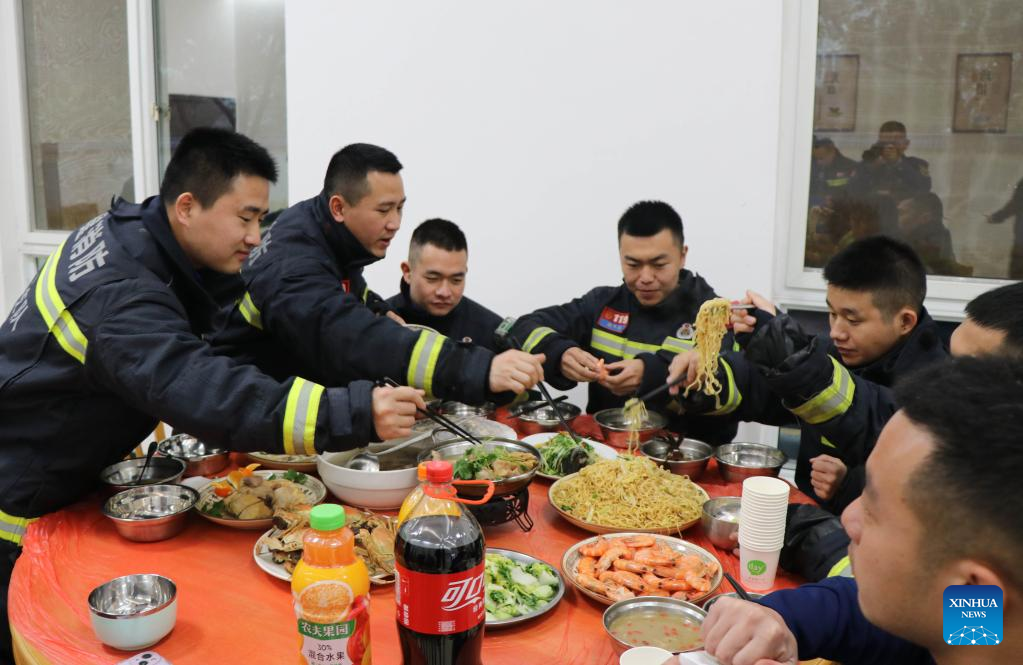 Firefighters enjoy a feast on the eve of the Spring Festival in Longyan, southeast China's Fujian Province, Jan. 21, 2023. On the eve of the Spring Festival in China, while some people reunite with their families and friends, there are others who still stick to their posts away from home. Nevertheless, nothing can stop a warm gathering and delicious festive dinner while they await the arrival of the Spring Festival. (Photo by Zhou Yangdong/Xinhua)