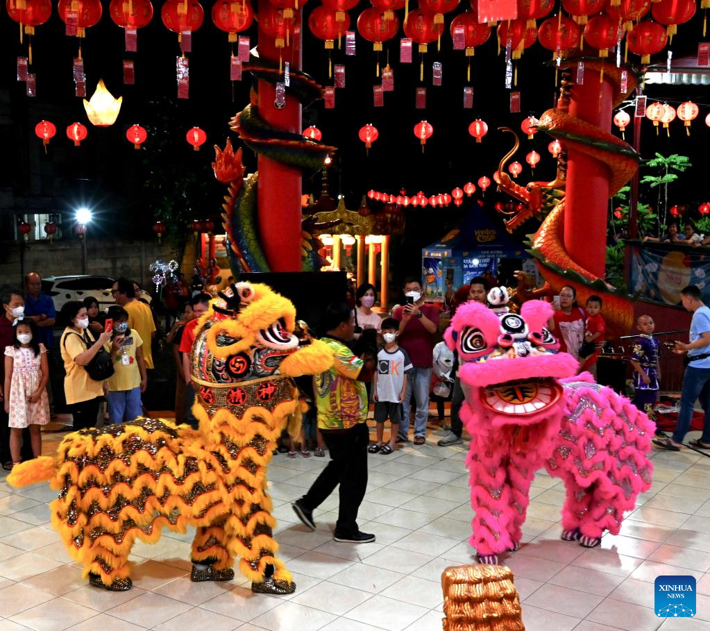 People watch a lion dance performance in celebration of the Chinese New Year at Kwan In Tang temple in Pondok Cabe, South Tangerang, Indonesia, Jan. 21, 2023. (Xinhua/Agung Kuncahya B.)