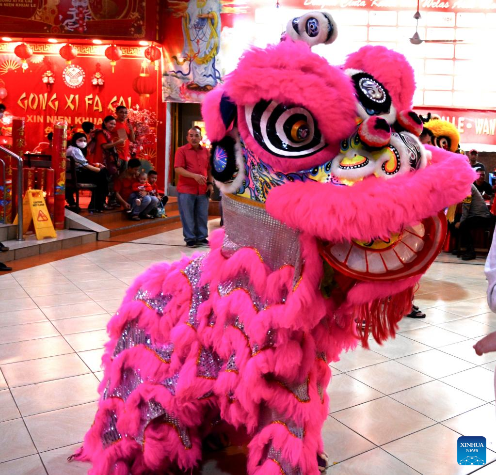 A lion dance performer takes part in an event celebrating the Chinese New Year at Kwan In Tang temple in Pondok Cabe, South Tangerang, Indonesia, Jan. 21, 2023. (Xinhua/Agung Kuncahya B.)
